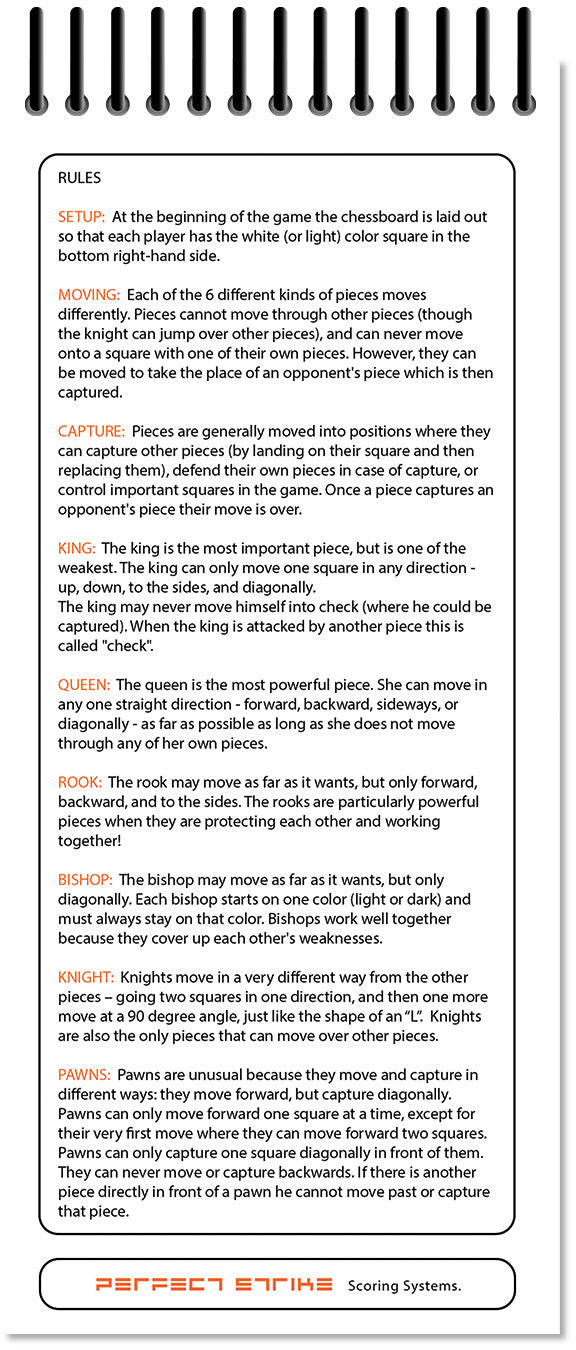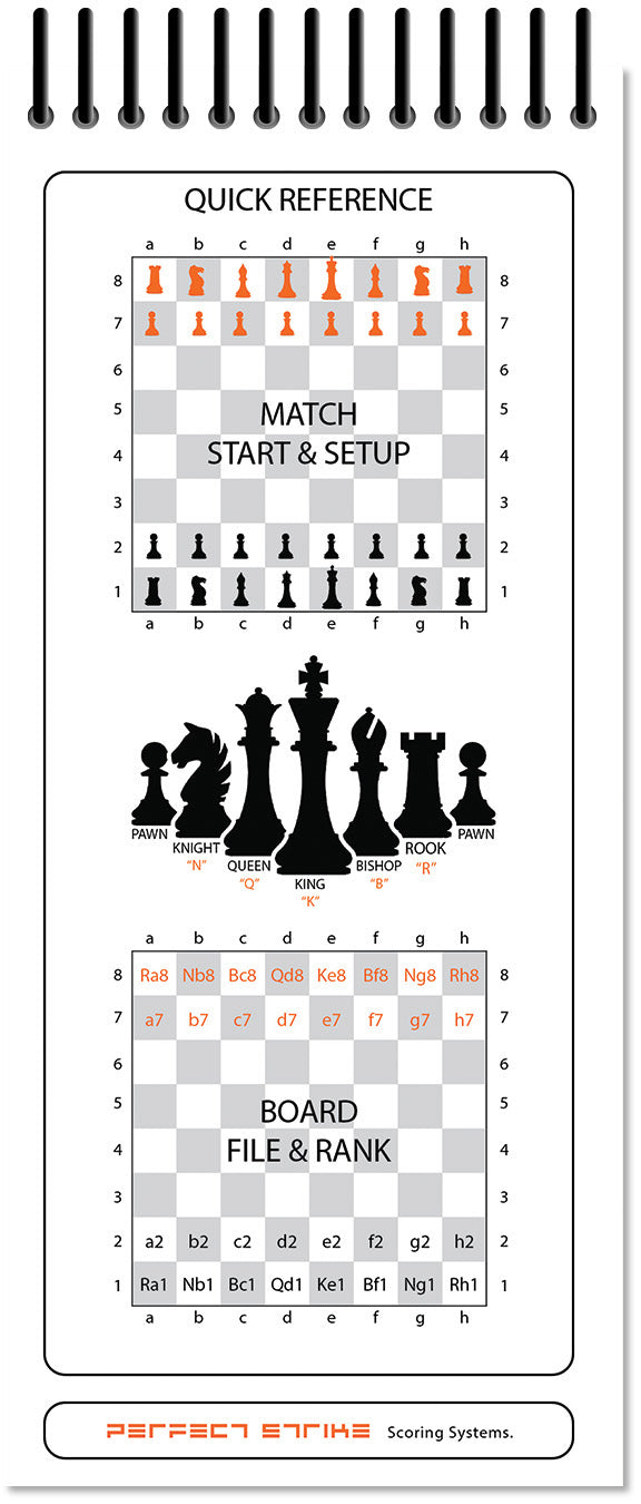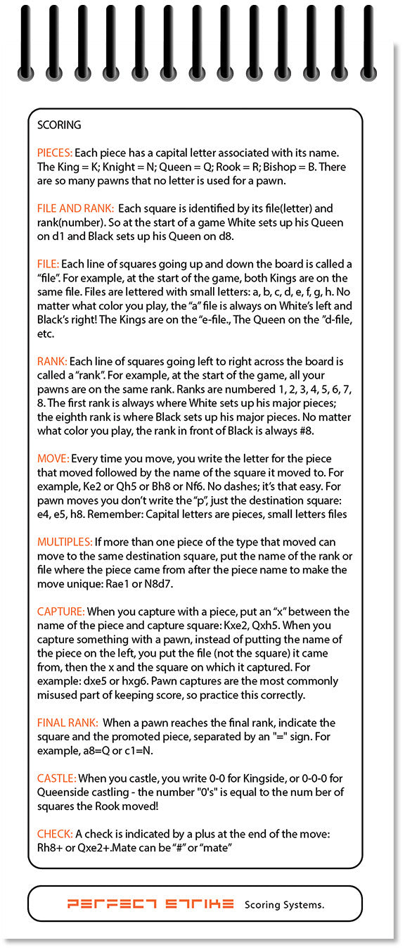 - CHESS SCOREBOOK : Perfect Strike archival quality, heavy duty chess scorebook. Convenient size for scoring chess games and matches. 3.5" x 8.5". 50 Games records per book. 50 possible chess moves per game. Classic score book design, improved for easier recognition. Included with the chess score book are sheets for Rules, Scoring and Board Positioning.